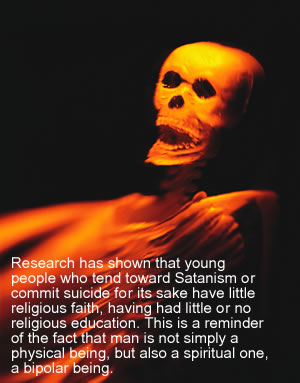 Research has shown that young people who tend toward Satanism or commit suicide for its sake have little religious faith, having had little or no religious education. This is a reminder of the fact that man is not simply a physical being, but also a spiritual one, a bipolar being. If a person is not spiritually satisfied, they will search for satisfaction in another place, sooner or later, no matter their financial status. This search can sometimes lead down the wrong path; Satanism is the most obvious example. Unfortunately, the education given in our schools today does not fill this spiritual void. In fact, it is not aimed at doing so. The rapid growth in the number of youngsters who resort to Satanism, drugs, etc. is the most distressing result of this. Similarly, recent research shows that the age for drinking alcohol has dropped to 13, a fact that jeopardizes the future of these young people and consequently of our society. Parents, educators, religious officials, theologians, society, and government officials should fulfill a role in order to fill the spiritual void suffered by young people. Whether one has religious beliefs or not, we should provide our people with religious information; the majority of the population in Turkey are Muslim. The support our young people need is only available through proper religious education. If we neglect this issue, a spiritual void will emerge. Certain people will exploit this emptiness and the result will be, as in Satanism, that some youngsters will worship inappropriate objects, and even take on the risk of death for their cause. In fact, Satanism is a phenomenon contrary to human nature, as all monotheistic religions regard Satan as man's greatest enemy, the representative and promoter of all evil. Satan is neither an object of worship nor does he have a claim for divinity. Moreover, he did not in fact reject God (Abraham, 14/22). This is the very reality that lies under the contradiction and inconsistency of Satanism. There is a creature called Satan and some youngsters worship him and accept the risk of death for his sake. This is an anomaly that should be dealt with seriously. If we had informed our young people about God, the Prophet and Satan, nobody would now be worshipping Satan; Satan is a being that should be avoided and stayed away from. However, it is a sad fact that some of our young people worship Satan, man's greatest enemy, and in this way they help him to ask for help from his enemy.