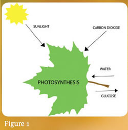 In order to answer these questions, let’s first take a closer look at the nature of leaves and how they function. Simply put, leaves are nature’s food factories. During spring and summer the leaves serve as factories where most of the food necessary for tree growth is manufactured. The process of transforming water and carbon dioxide into sugar is called photosynthesis, which means literally “putting together with light” (Figure 1). This food-making process is performed by the chlorophyll molecules that are present in the leaf cells. Chlorophyll absorbs energy from sunlight. While the water is sucked in from the soil by the roots and carbon dioxide is inhaled through the pores of the leaves, chlorophyll synthesizes carbohydrates, such as sugars and starch. During winter, when this process cannot continue due to lack of light or water, the trees rest and live off the food they stored during the summer.