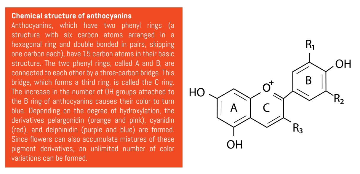 Changes in the molecular structure of the cited substances is what lies behind plants’ having thousands of different colors and shades. With the differentiation of the R1, R2, and R3 groups shown in the figure, anthocyanin absorbs different ranges of light and gives the plant different colors. These molecules’ structures change at the primary, secondary, and tertiary levels. When the groups indicated by (R) in the figure are replaced by hydrogen (H), hydroxide (OH), or alkyl (R), the color changes. If a green leaf turns yellow at first and red later, it means these chemical changes are taking place in its molecules.